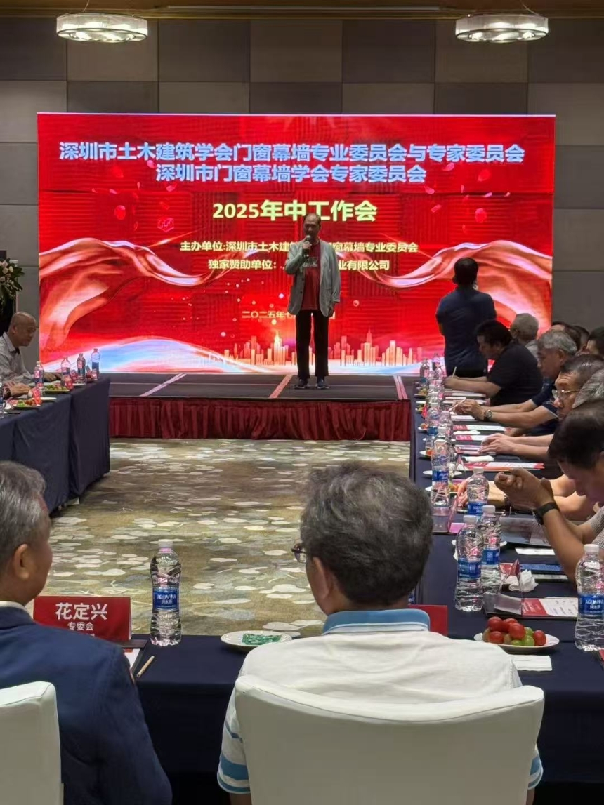 2025–7–26。深圳市幕墙行业专家工作会议在益田酒店举行。会议由闭思廉总工主持 ,刘福义,杜总分别代表学会和承办单位致辞。花定兴代表专业委员会做工作报告,姜成爱和杜继予分别回顾历史和总结。