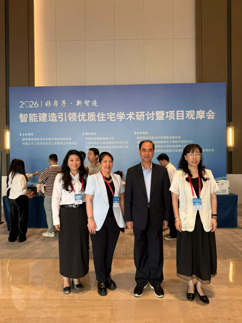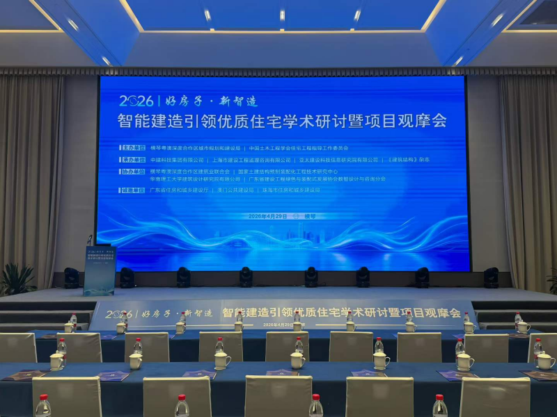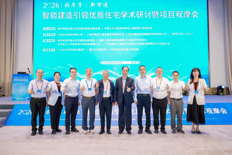 2026年4月29日智能建造、引领优质住宅学术研讨暨项目观摩会在珠海横琴天沐酒店举行。会议由赵林董事长主持。张国基、张𡶶、黄维德、熊衍仁、刘榕分别致辞。学术报告由刘福义、罗赤宇、郁银泉主持。欧进萍院士、李国强院士做主旨报告。6位专家做学术报告,来自全国的嘉宾近500人出席。会后参观了由横琴粤奥深度合作区建设的彩棠苑租赁住房项目。